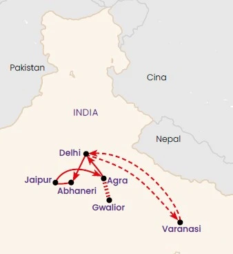Itinerario del viaggio “Passaggio in India”: un affascinante percorso tra le città sacre e regali dell’India del Nord, da Delhi a Varanasi passando per Jaipur, Agra e Abhaneri.